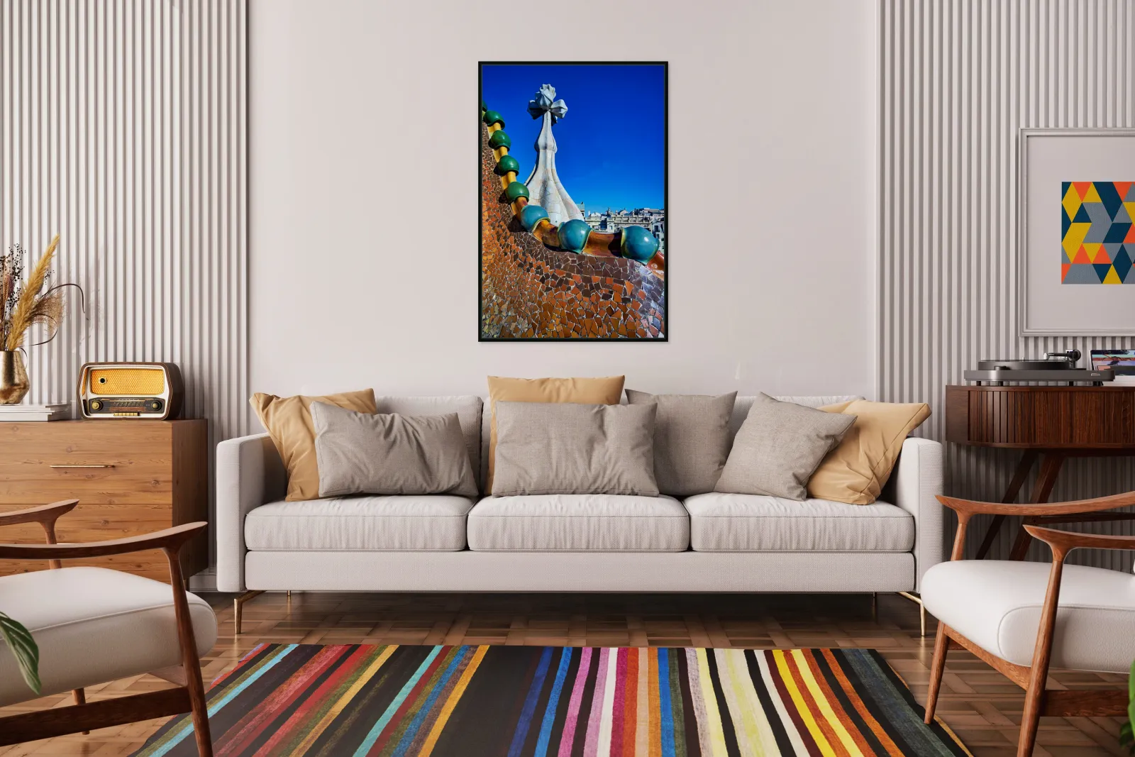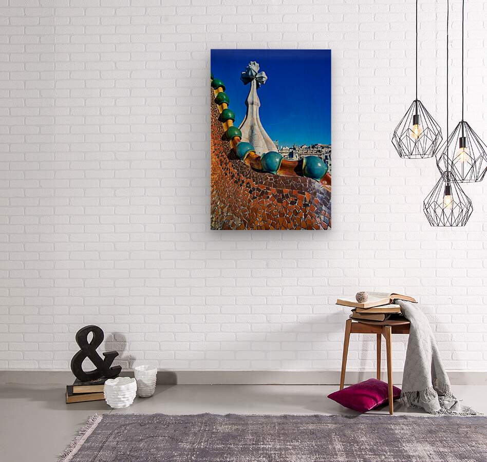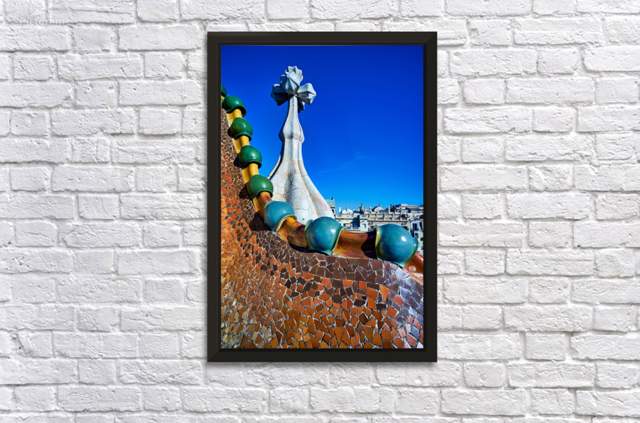 "Exploring Casa Batllo in Barcelona under a clear sky" in a framed print.