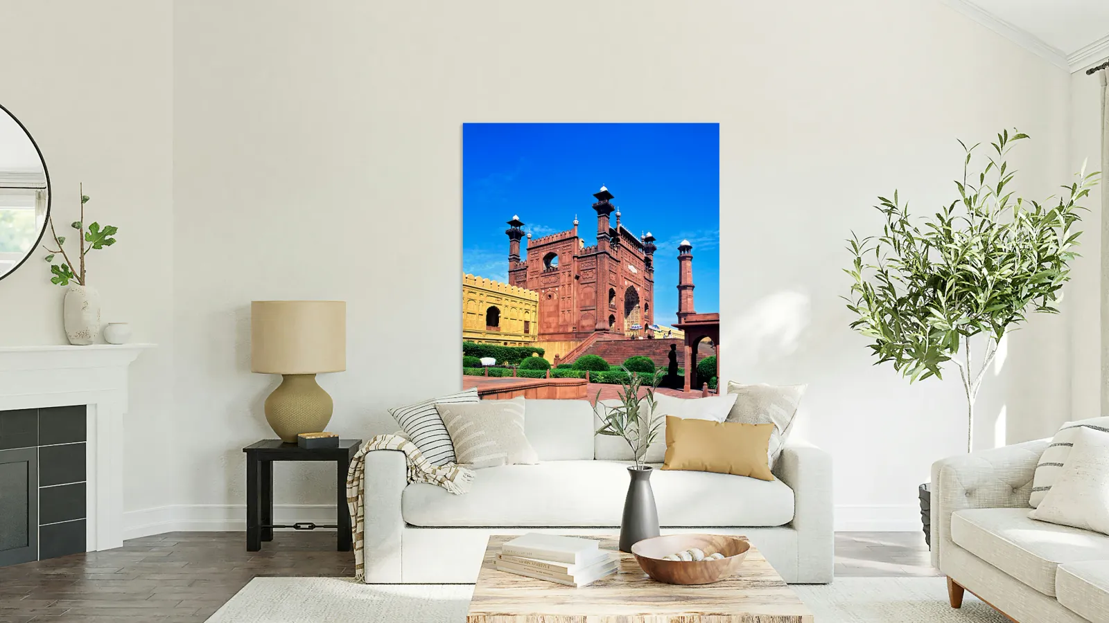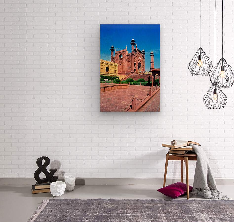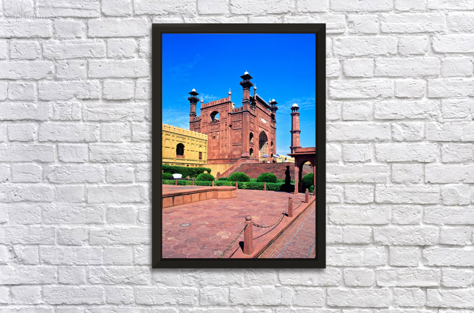 "Mosque stands tall in Lahore with clear blue sky above" in a framed print.