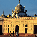 People walk near the Badshahi Mosque in Lahore during the evening. The mosque shows its architecture under the setting sun.