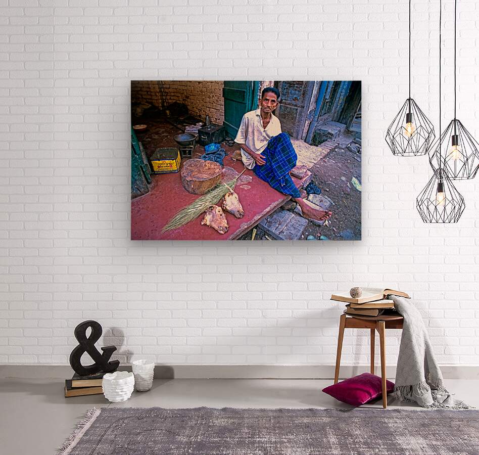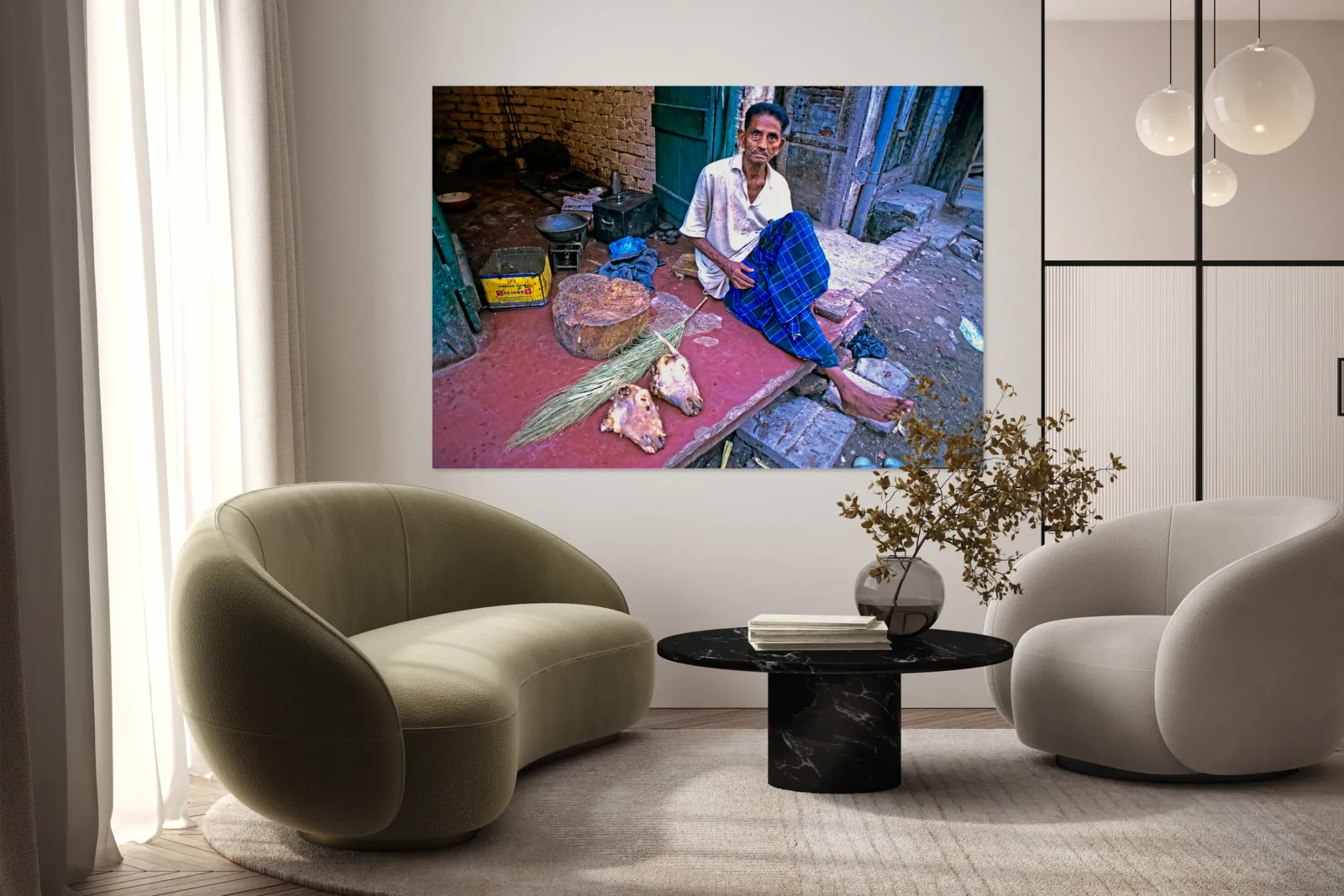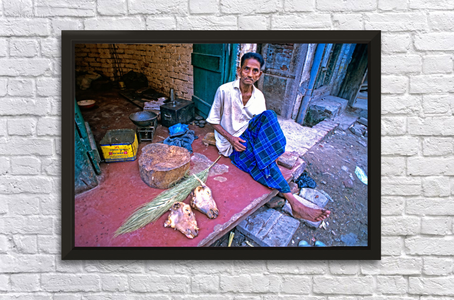 "Street butcher working in Lahore during daytime hours" in a framed print.