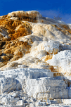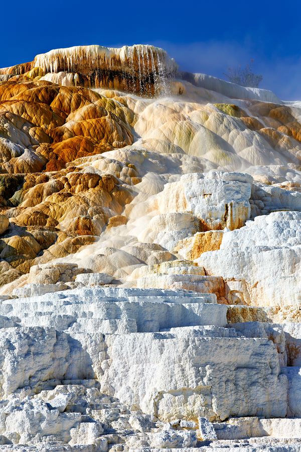 Visitors view the unique formations of Devils Thumb at Yellowstone National Park. Steam rises from the ground during a sunny day.
