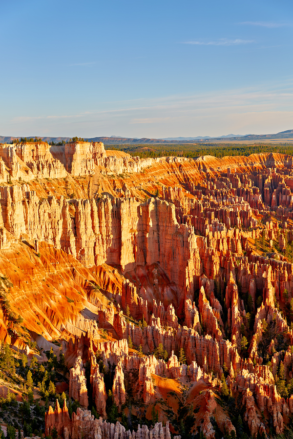 People gather at Bryce Point to enjoy views of the orange rock formations and canyons of Bryce Canyon National Park during sunset.