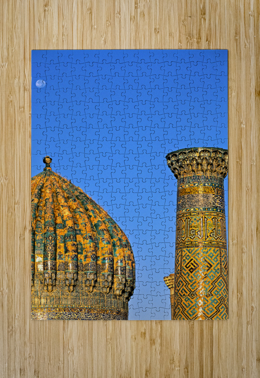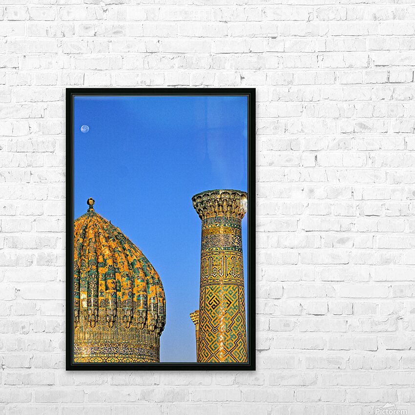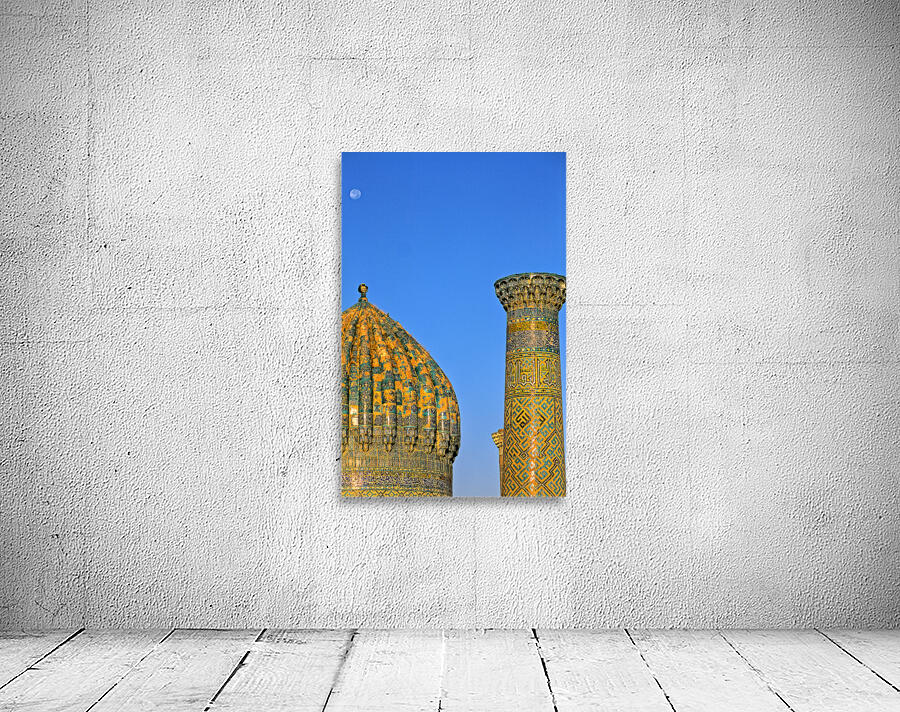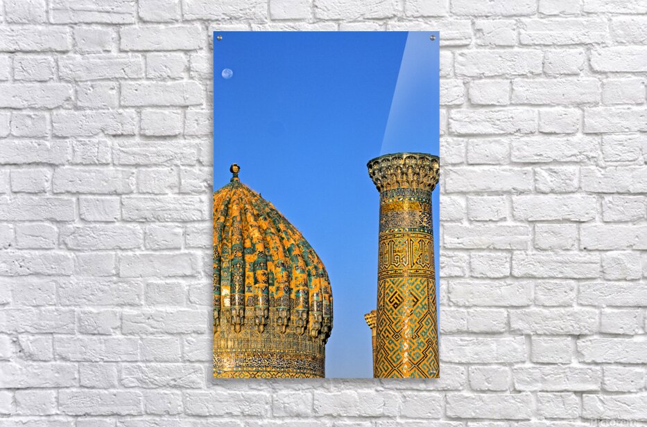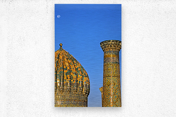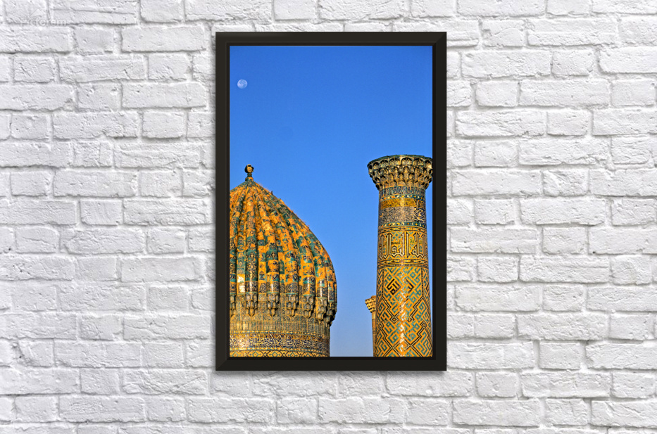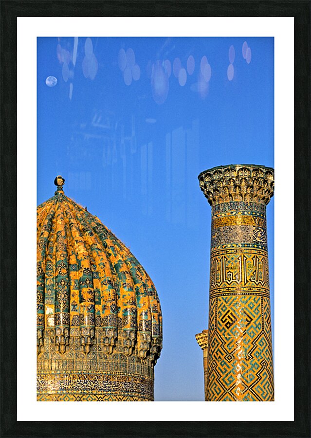 "Madrasa in Samarkand shows dome and column under the moon" in a framed print.