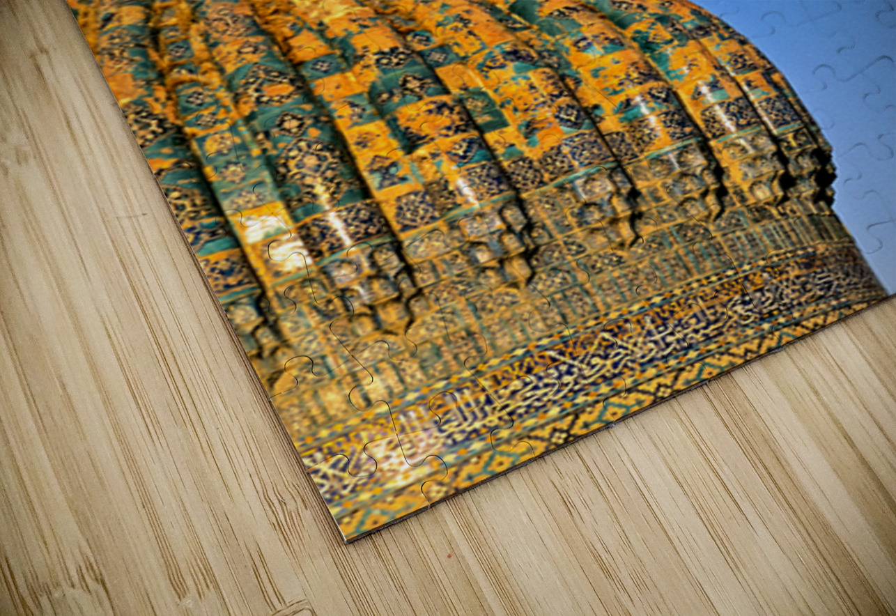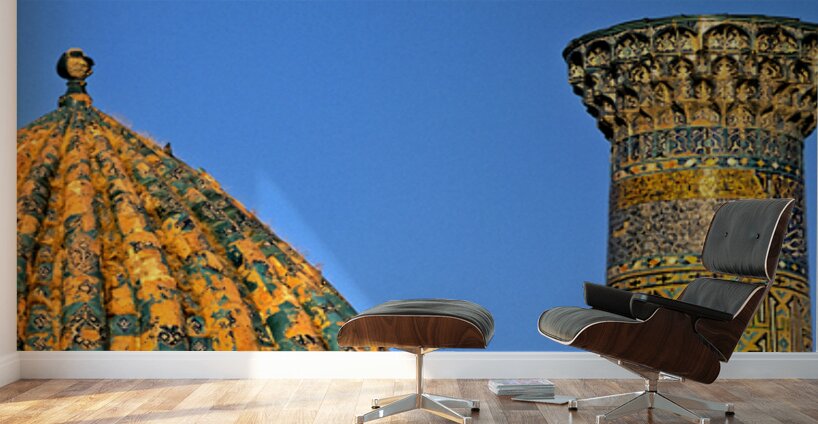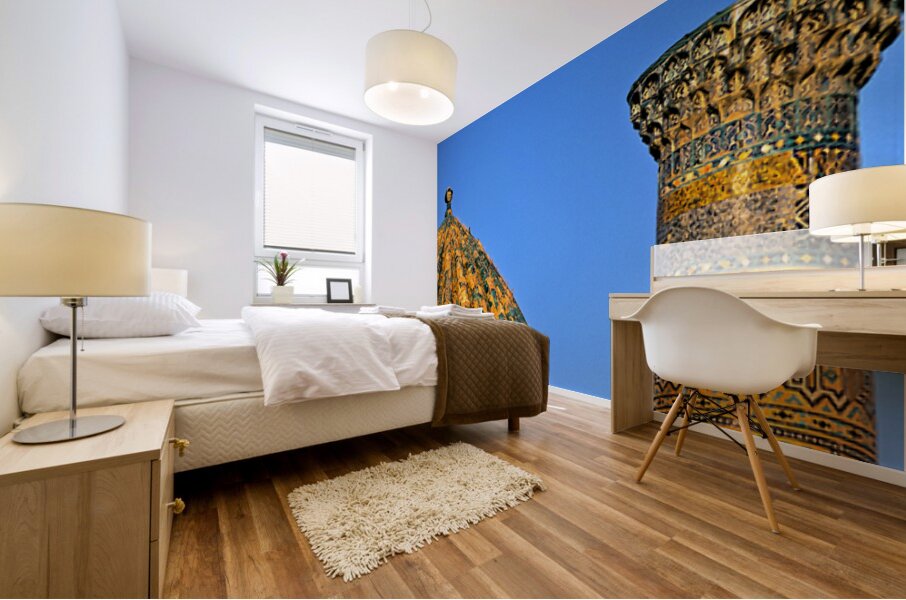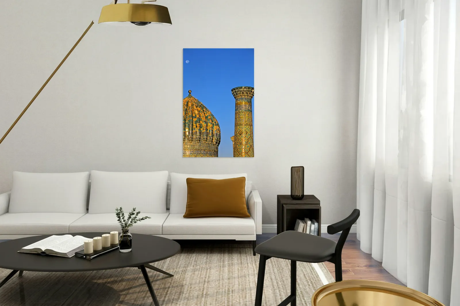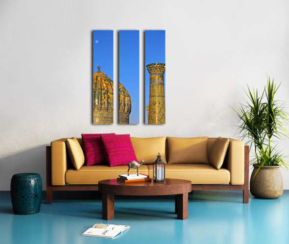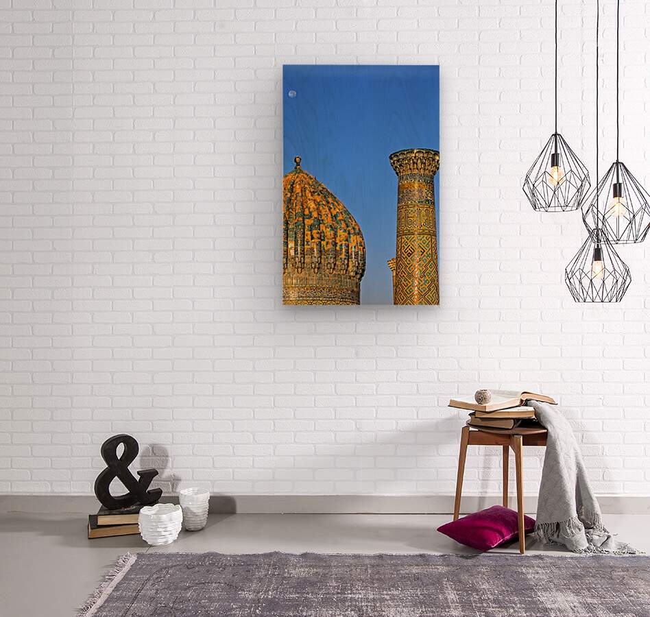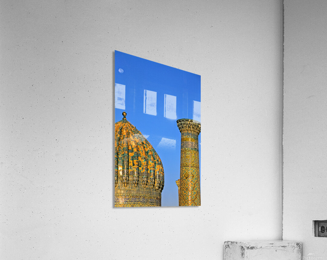 "Madrasa in Samarkand shows dome and column under the moon" in a framed print.