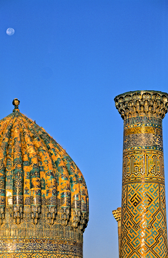 A madrasa in Samarkand features a colorful dome and an ornate column under a clear blue sky with a visible moon.