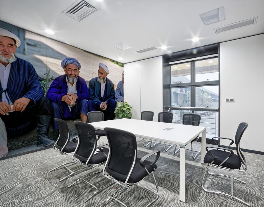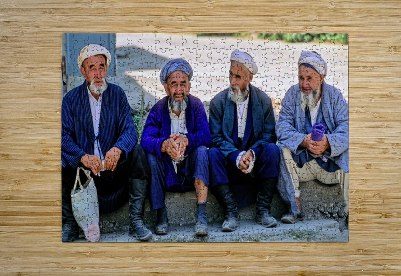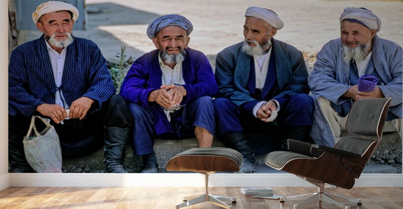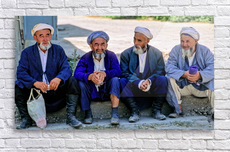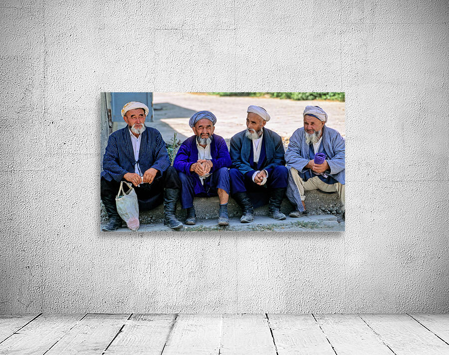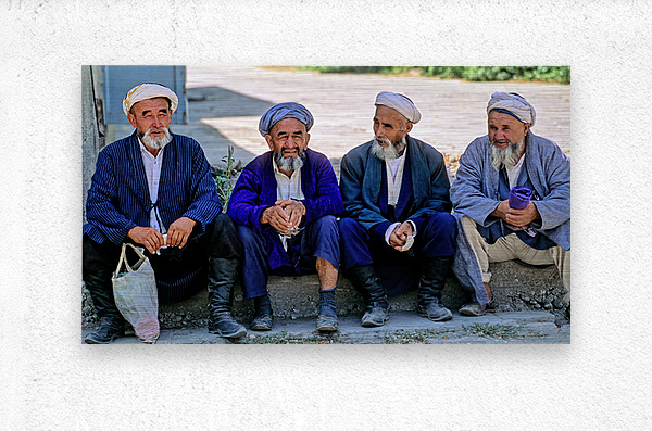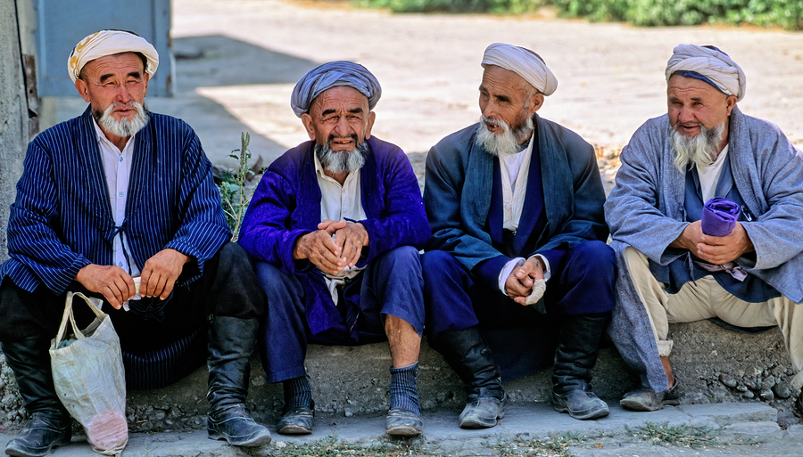 Four old men gather on a street in Samarkand. They wear traditional clothing and share stories in the sunlight.