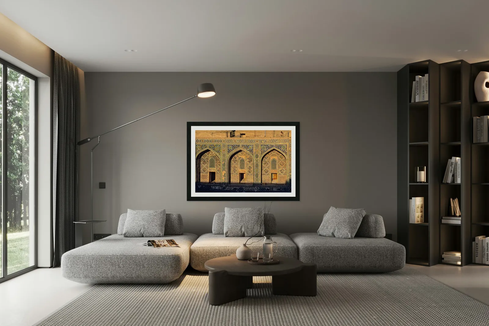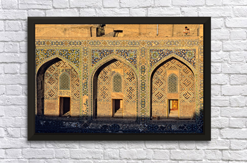 "Madrasa architecture in Samarkand shows detailed design work" in a framed print.