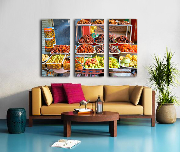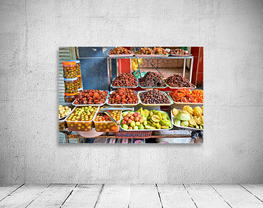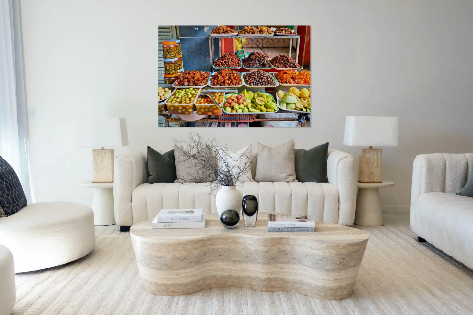 "Fruit and snack stall in Hanoi Vietnam during the day" in a framed print.
