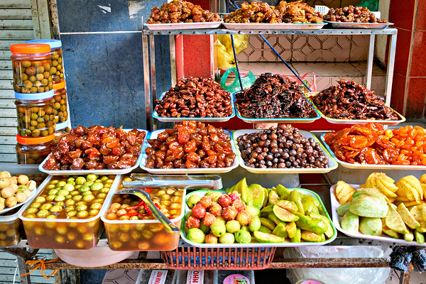 Local vendors sell various fruits and snacks at a busy market in Hanoi. The colors and shapes attract many customers nearby.