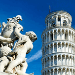 Visitors stroll through Piazza dei Miracoli as they admire the Leaning Tower of Pisa under a clear blue sky in Tuscany.