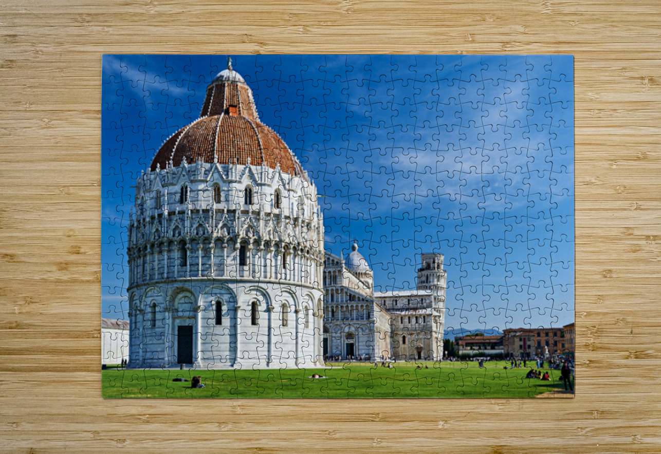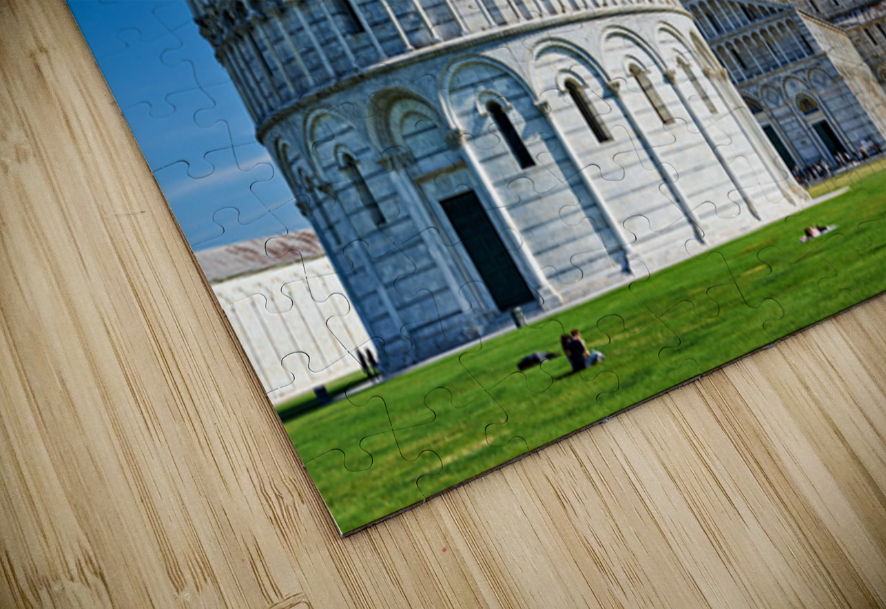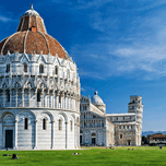 People explore the Piazza dei Miracoli in Pisa Italy. The Cathedral stands next to the famous leaning tower.