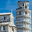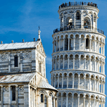 Visitors gather in Piazza dei Miracoli to see the Leaning Tower and Cathedral in Pisa Tuscany under a clear blue sky.