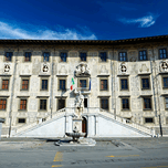 Visitors gather in Piazza dei Miracoli to see the Leaning Tower and Cathedral in Pisa Tuscany under a clear blue sky.