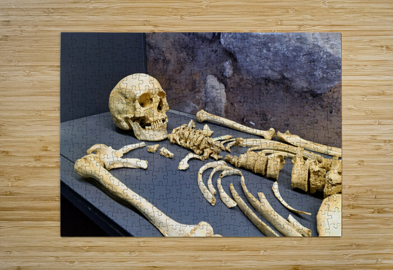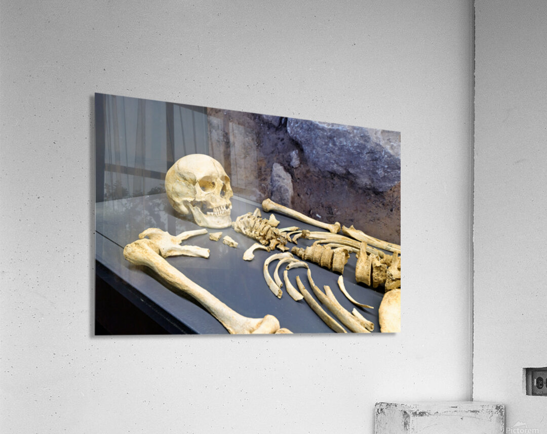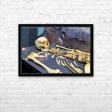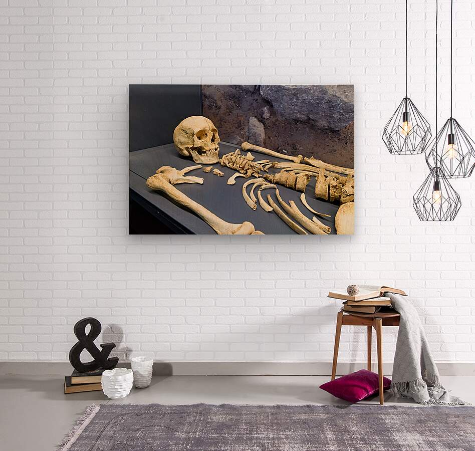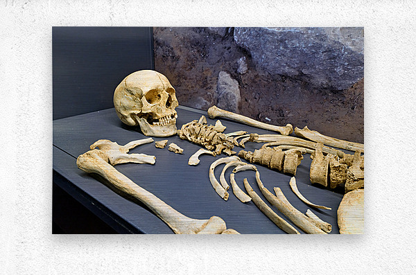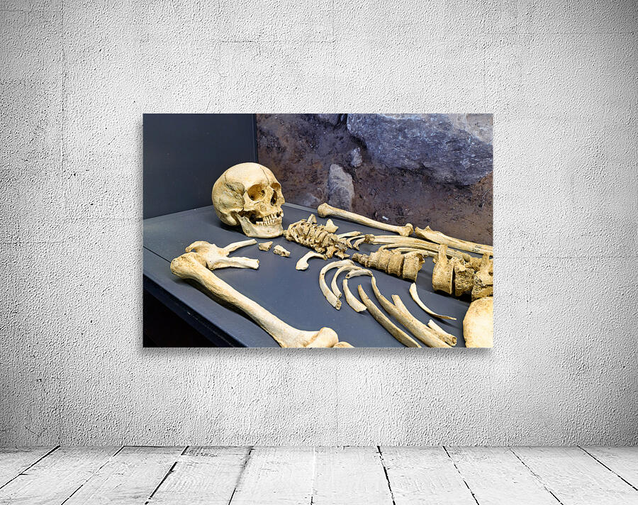 Remains of a tomb are on display at Guarnacci Museum in Volterra Tuscany showing ancient skeletal artifacts.