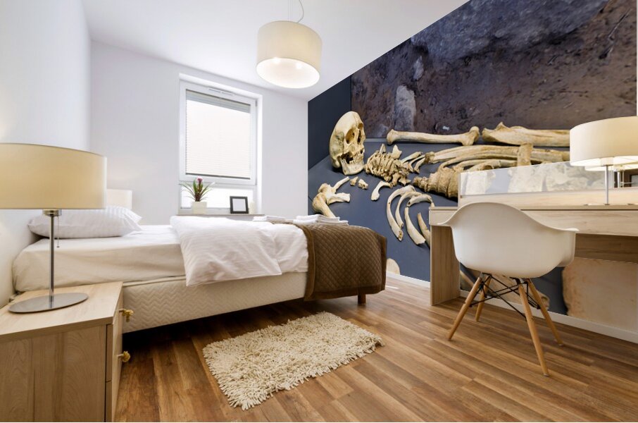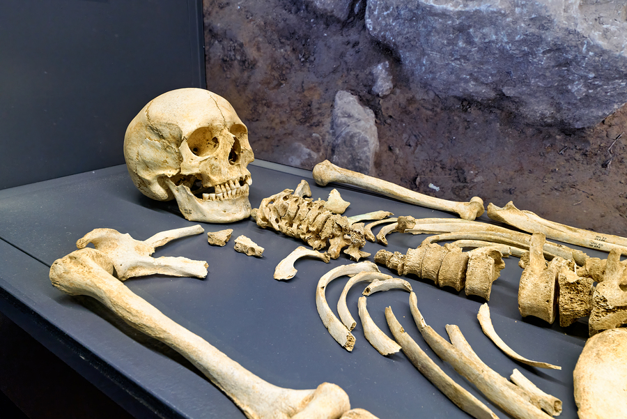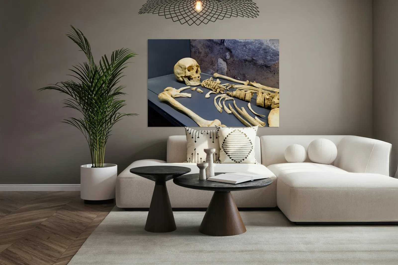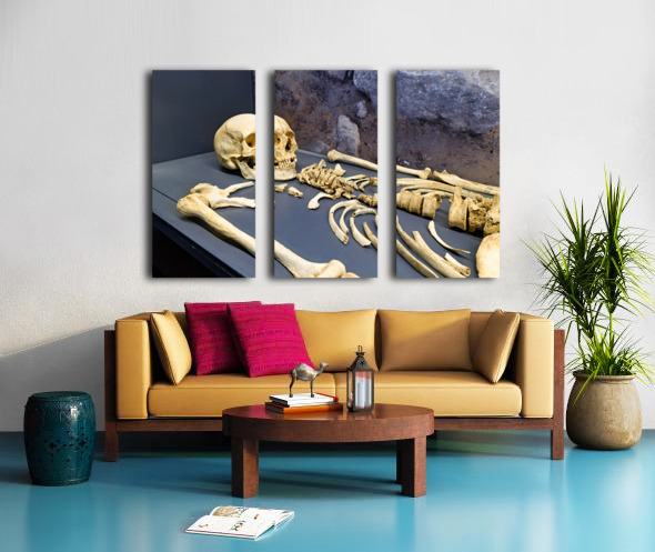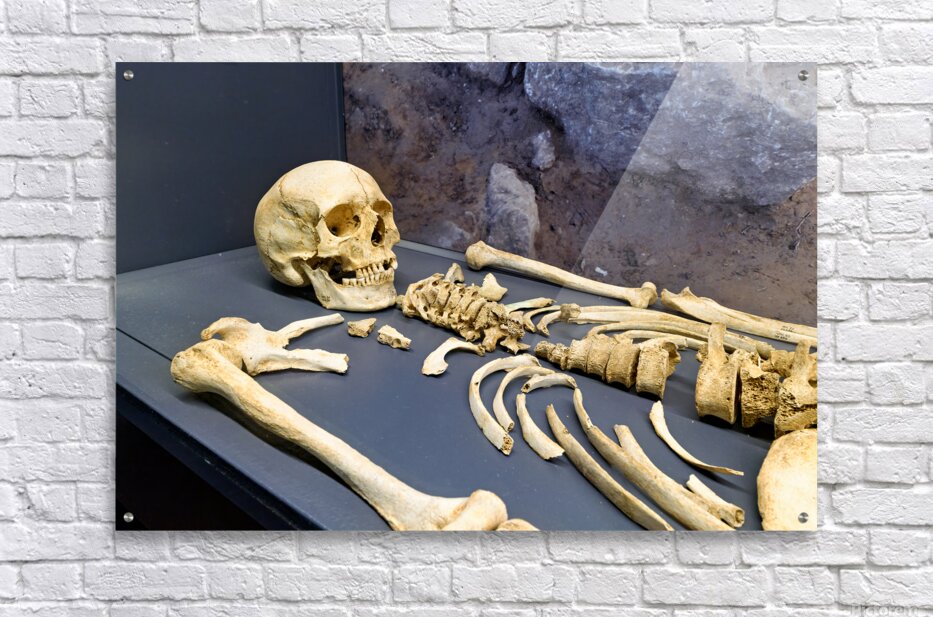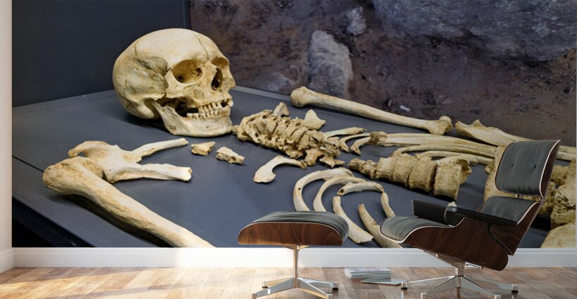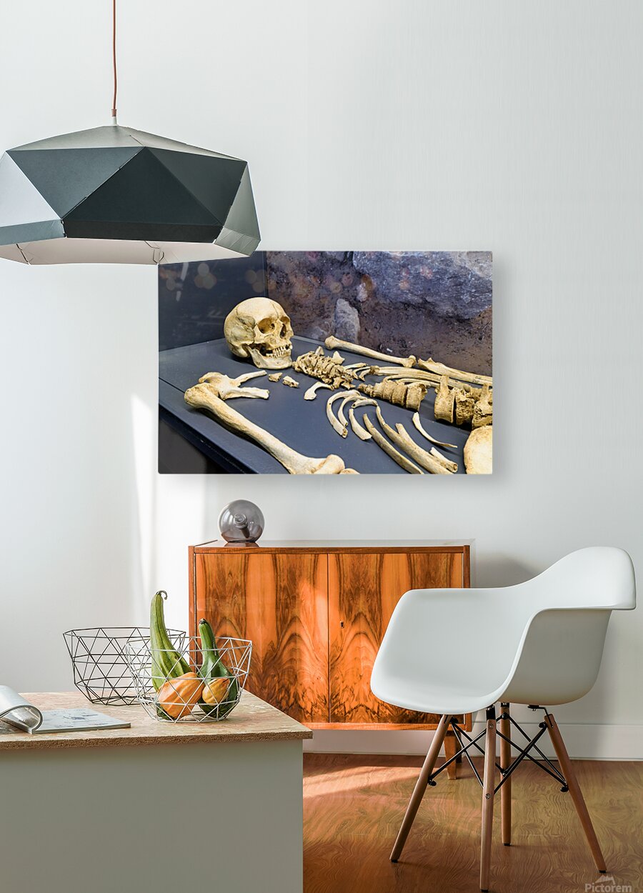 Remains of a tomb are on display at Guarnacci Museum in Volterra Tuscany showing ancient skeletal artifacts.