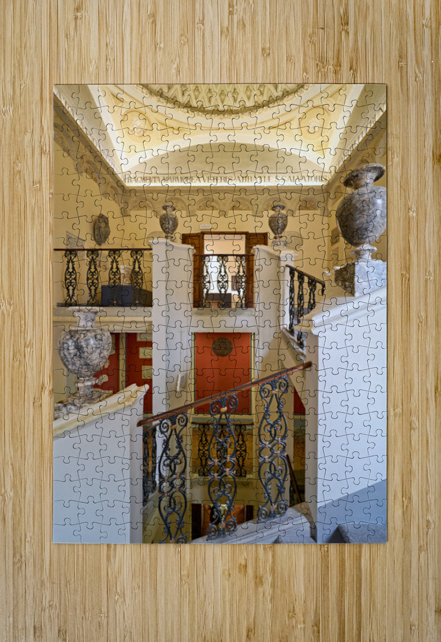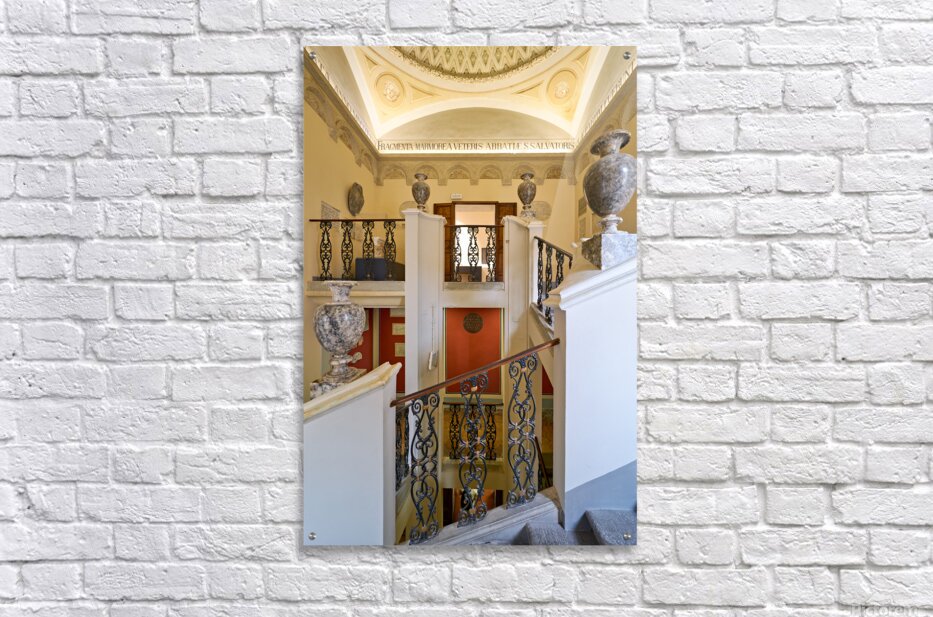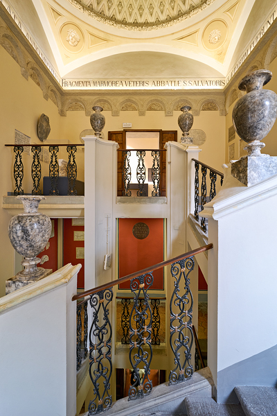 Visitors walk through the Guarnacci Museum in Volterra Tuscany where Etruscan artifacts are displayed along a staircase.