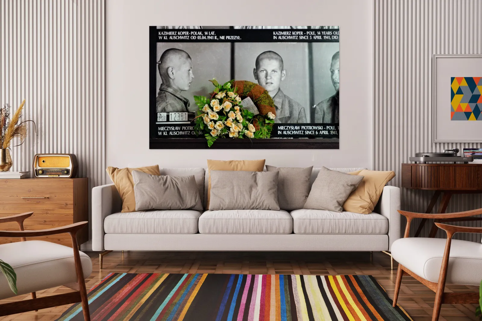 "Remembering the lives lost at Auschwitz concentration camp" in a framed print.