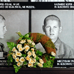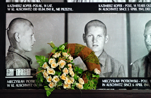 Flowers are placed at a memorial with photos of young boys who lost their lives at Auschwitz in Krakow Poland during World War II.