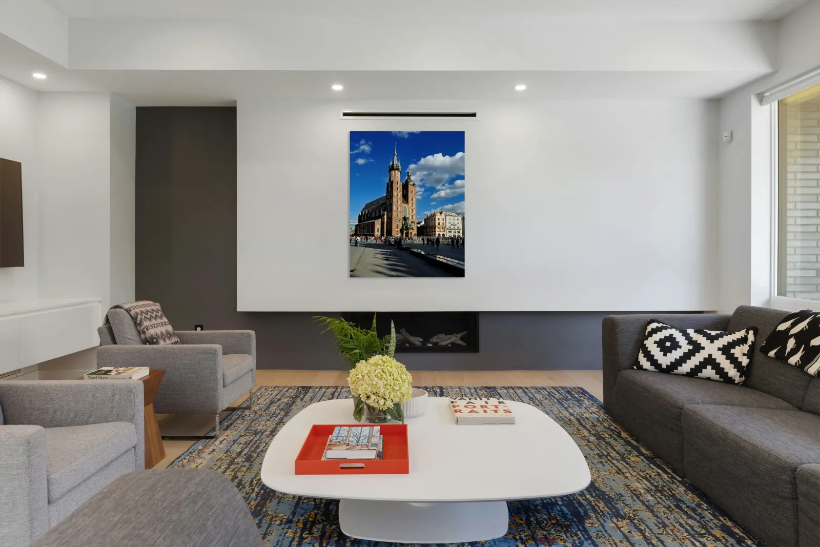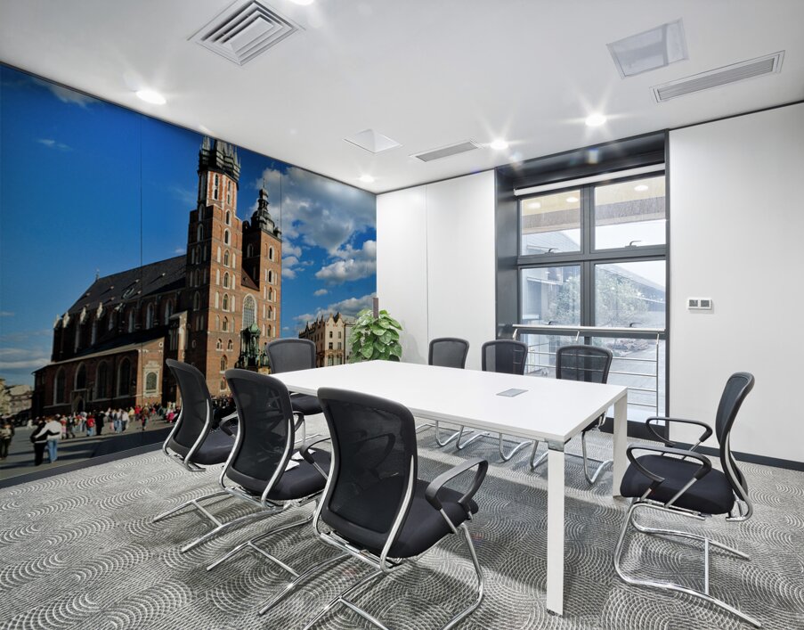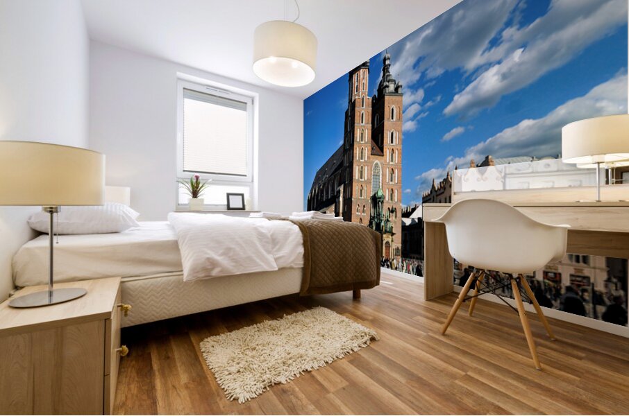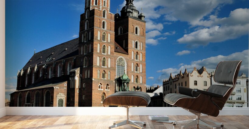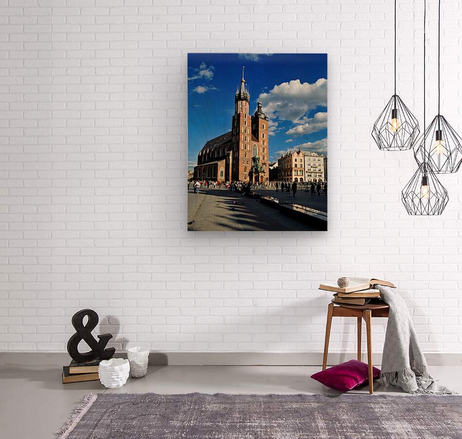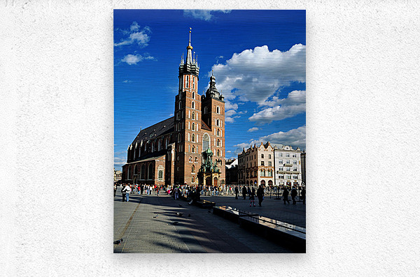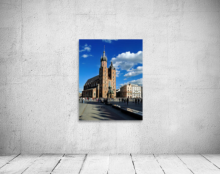 "Krakows historic church and lively square in clear weather" in a framed print.