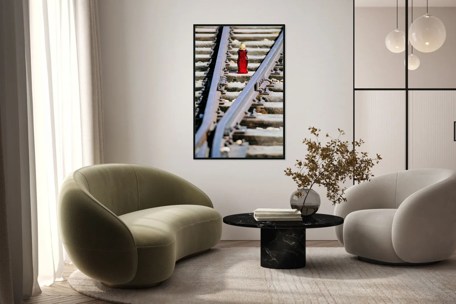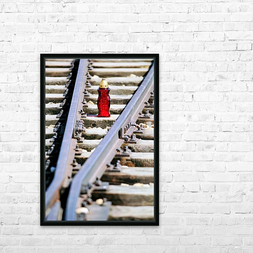 "Train tracks in Auschwitz concentration camp in Krakow" in a framed print.