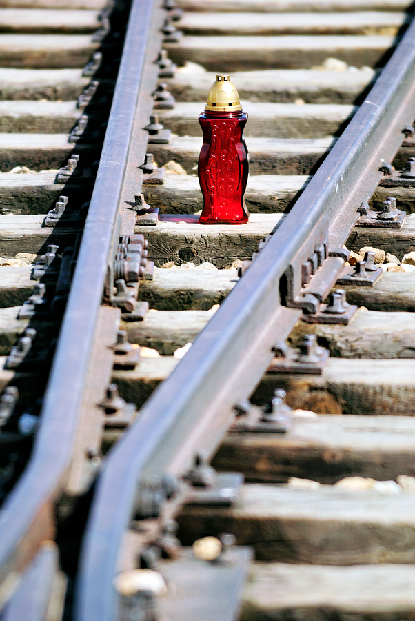 In Auschwitz concentration camp a red object stands on the train tracks. The scene captures a historical location linked to World War II.