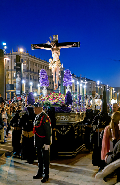 Crowds gather in Zaragoza for Easter Holy Week processions featuring a prominent crucifix. The evening sky adds to the solemnity of the event.
