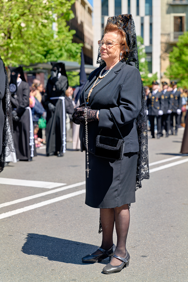 People gather in Zaragoza for the Easter Holy Week procession. Traditional clothing and religious items are displayed during the event.