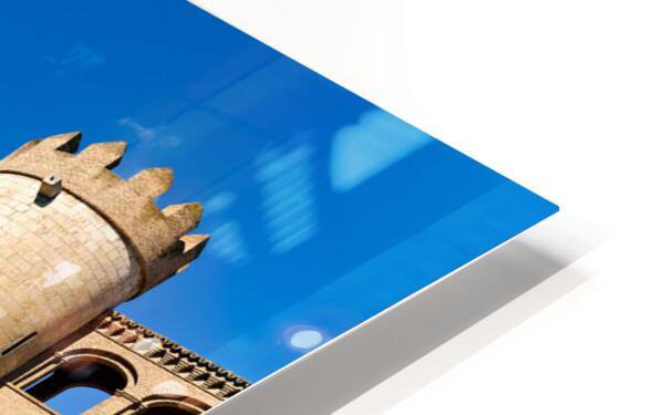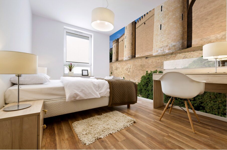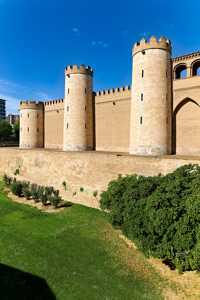 Visitors can see the strong stone towers of Aljaferia Palace set against the blue sky in Zaragoza Spain. This site shows rich history.