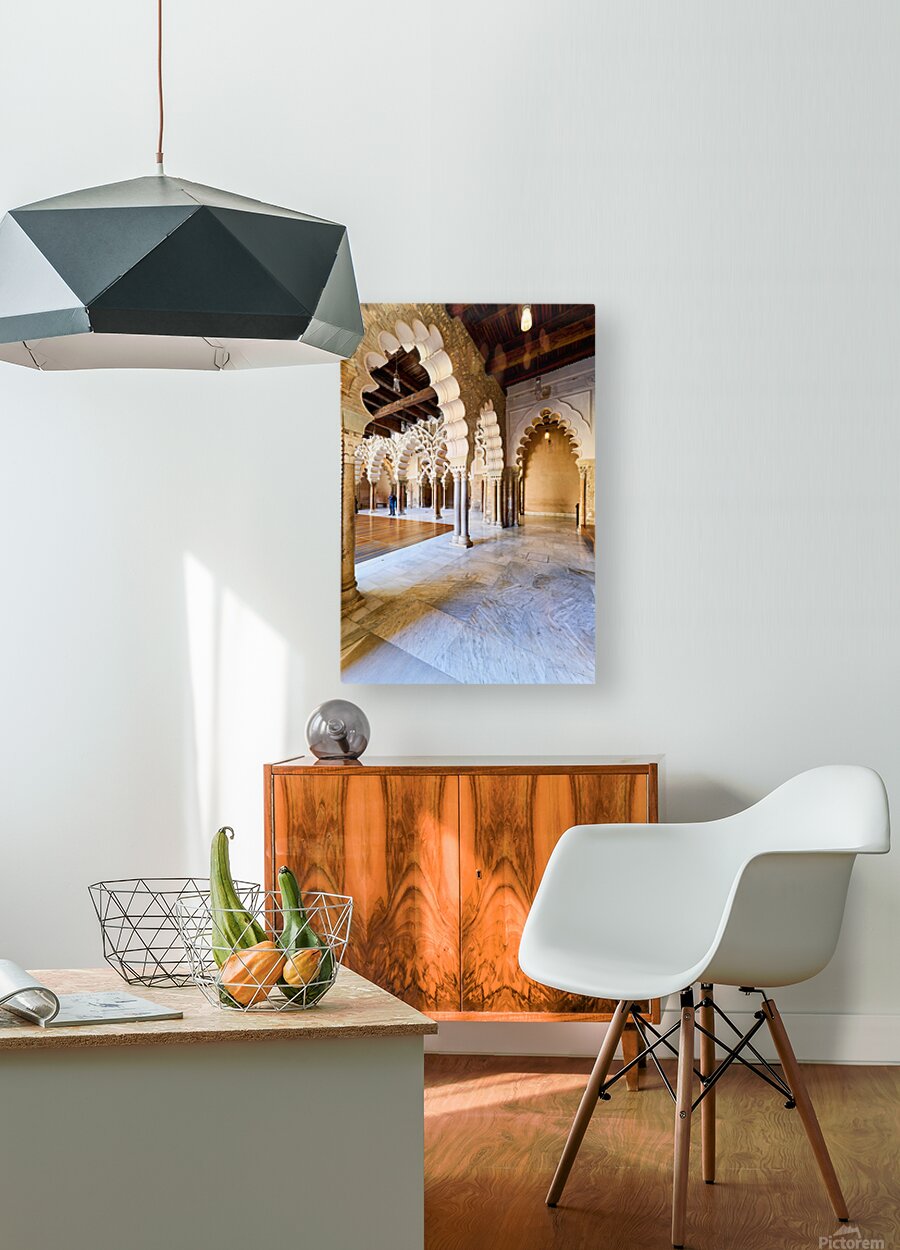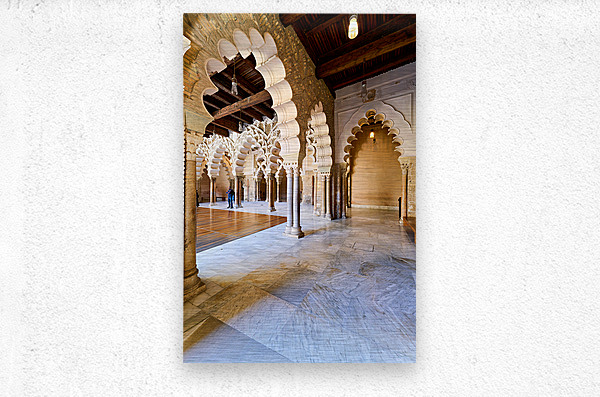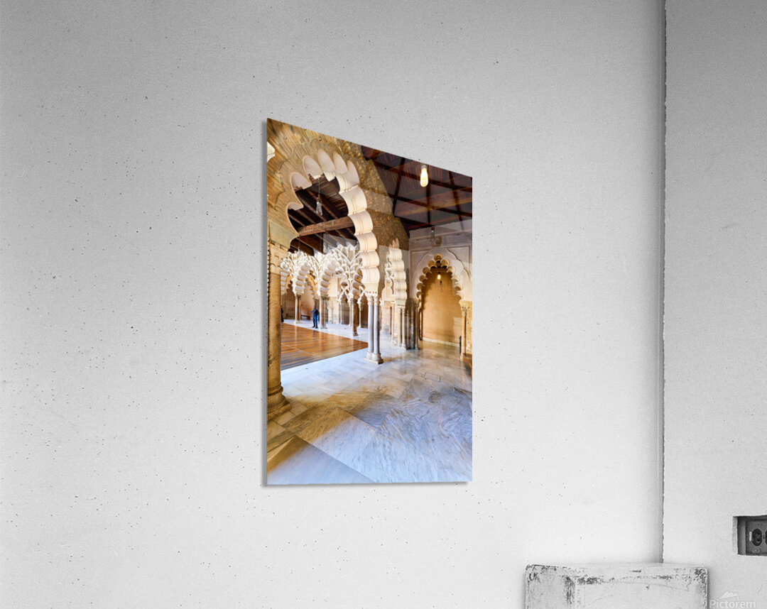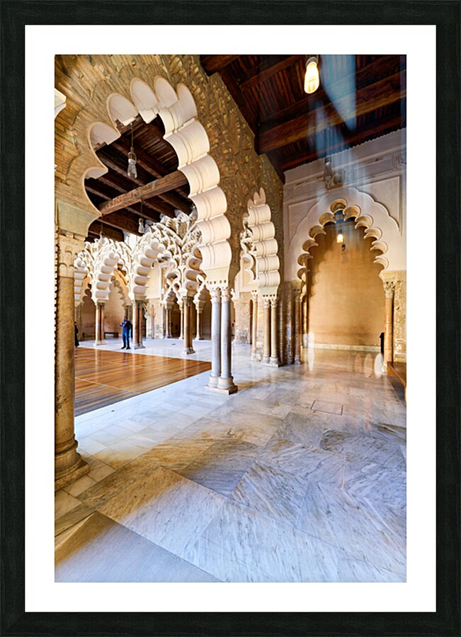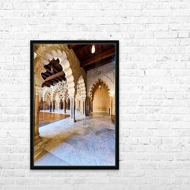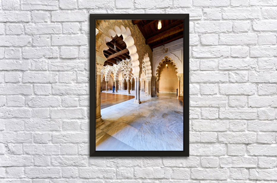 "Explore Aljafería Palaces stunning architecture" in a framed print.