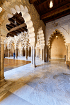 People walk through the halls of Aljafería Palace in Zaragoza Spain. The building shows its historical design and structure.