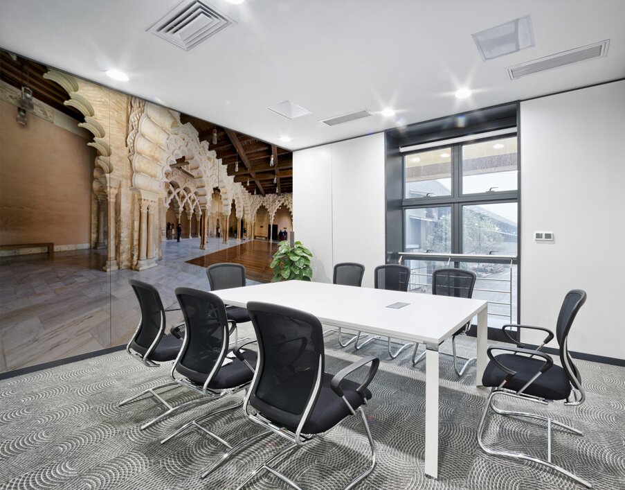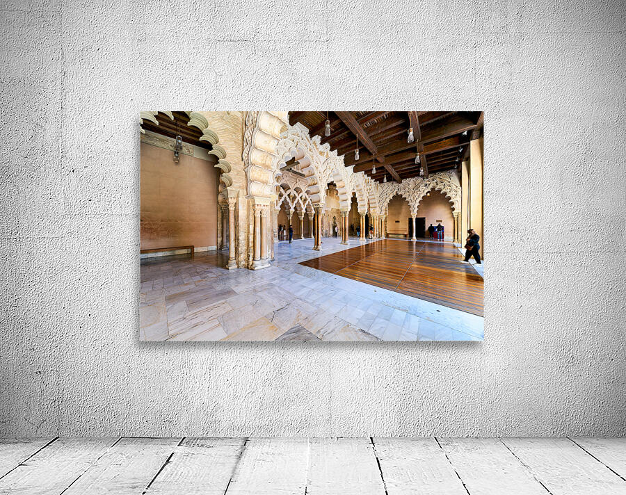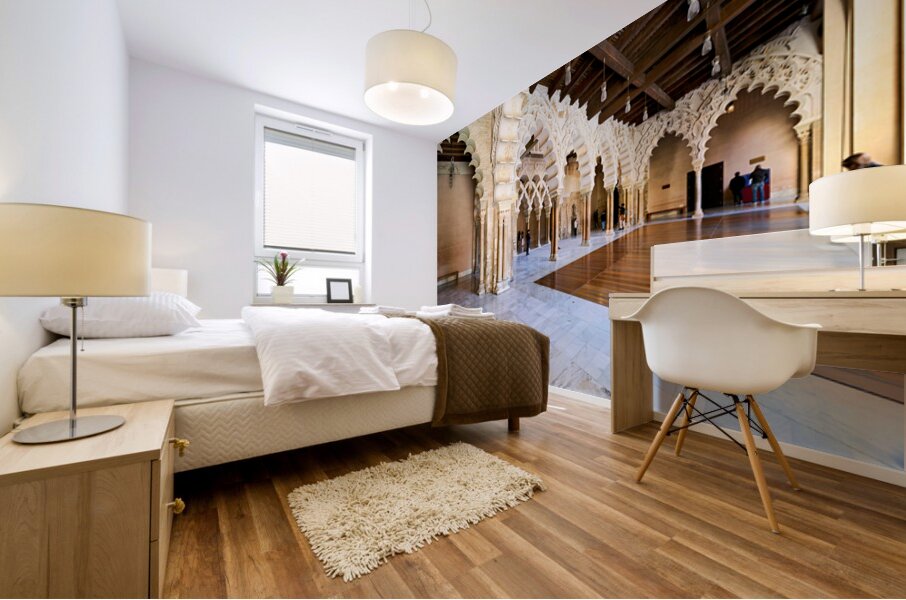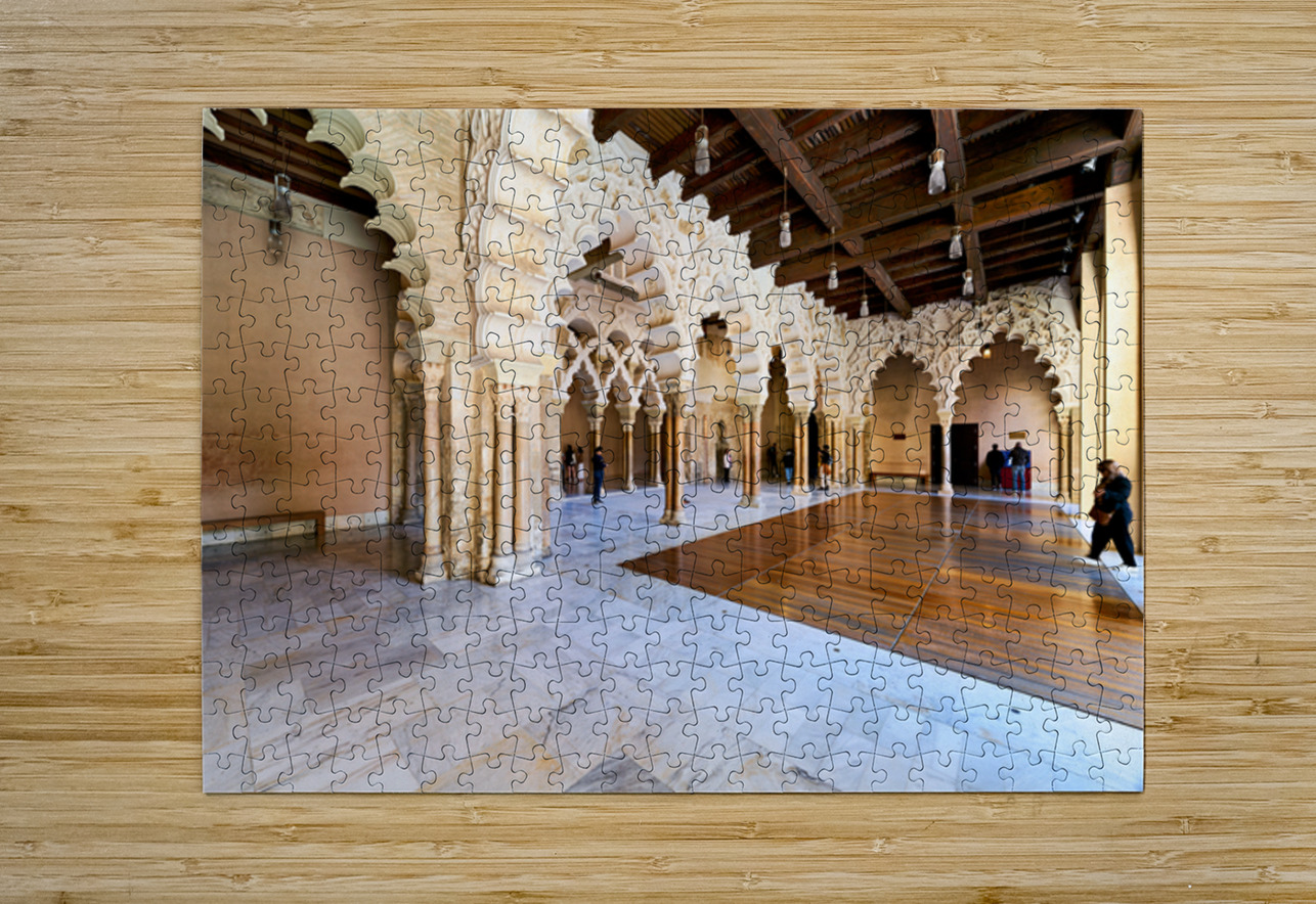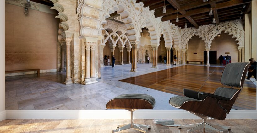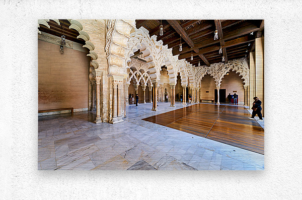 People explore the interior of Aljaferia Palace in Zaragoza Spain. The architecture features arches and columns in a historic setting.