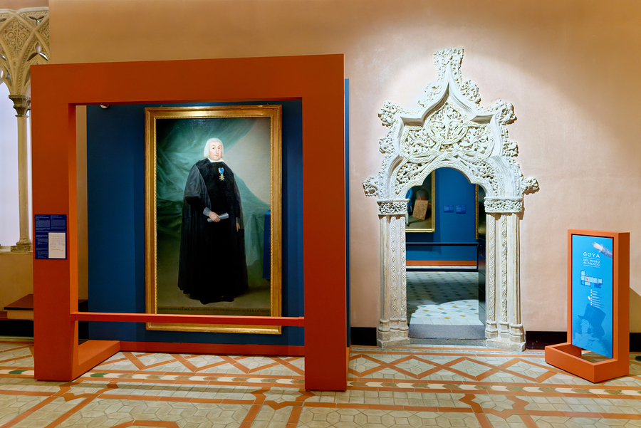 Visitors see a painting by Francisco de Goya at Aljafería Palace in Zaragoza. The exhibit shows a blend of art and history.
