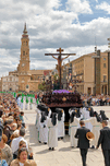 Crowds gather to watch a procession in Zaragoza during Easter Holy Week. Participants wear traditional clothing and carry religious symbols.