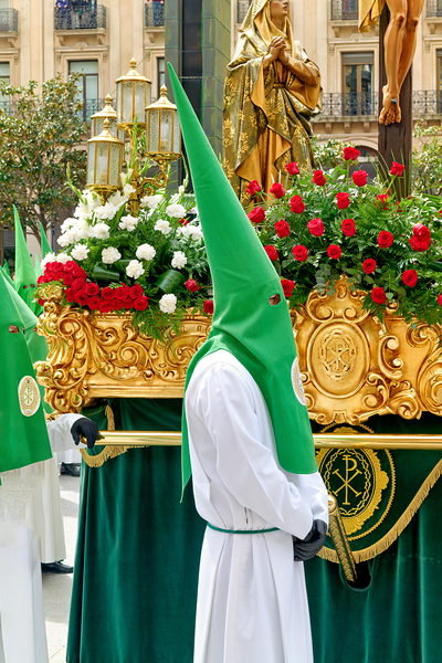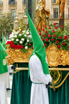 People take part in Easter Holy Week processions in Zaragoza. Participants wear robes and carry decorations as a part of the tradition.