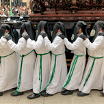 People walk in a procession wearing white robes and hoods. The event takes place in Zaragoza during Easter Holy Week celebrations.