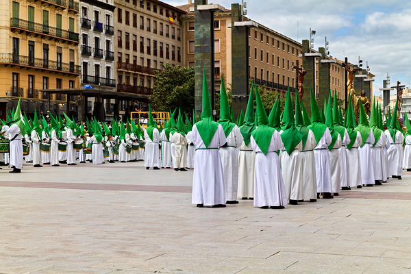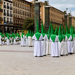 During Easter Holy Week in Zaragoza many people gather in the streets. They wear long robes and tall cones while taking part in processions.