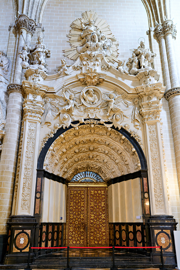 Visitors admire the entrance of the Cathedral of the Savior of Zaragoza in Aragon Spain showcasing detailed carvings and ornate design.