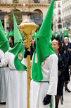 People take part in the Easter Holy Week processions in Zaragoza Spain. They wear pointed hoods and hold candles as part of the tradition.