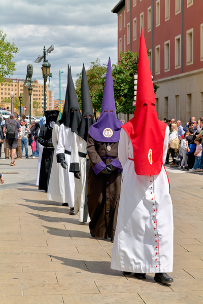 People walk in a procession wearing traditional costumes in Zaragoza during Easter Holy Week. The event draws many spectators from the area.
