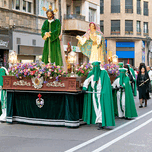 People gather on the street to watch a procession in Zaragoza during the Easter Holy Week. Participants carry large figures on a platform.
