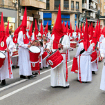 People participate in processions during Easter Holy Week in Zaragoza. They wear red outfits and carry drums as they march through the streets.