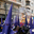 People gather to watch the Easter processions in Zaragoza. Participants wear traditional clothing and carry a religious statue through the streets.
