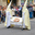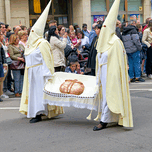 People participate in processions of Easter Holy Week in Zaragoza. Two figures carry a large bread-like object in the street.