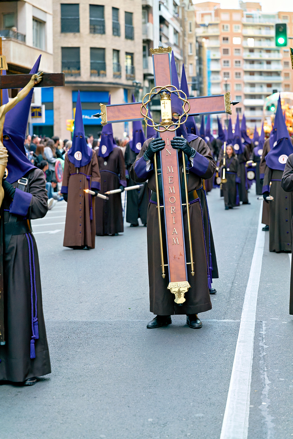 People take part in Easter Holy Week processions in Zaragoza. Participants wear robes and carry crosses through the streets.
