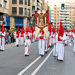 People gather on the streets of Zaragoza to watch processions for Easter Holy Week. Participants wear traditional robes and carry banners.