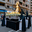 People gather on the street to watch a procession with a statue. Participants wear dark cloaks while carrying the statue on a float.