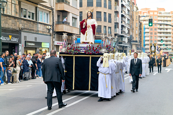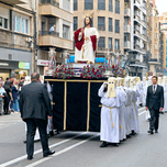 People gather on the street to watch a procession during Easter Holy Week in Zaragoza. Exhibits show costumes and religious themes.