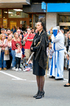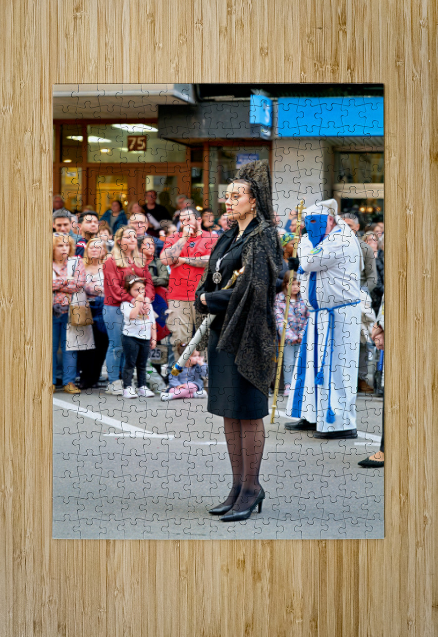 People gather to watch a religious procession in Zaragoza during Easter Holy Week. A woman stands holding a staff while others observe closely.