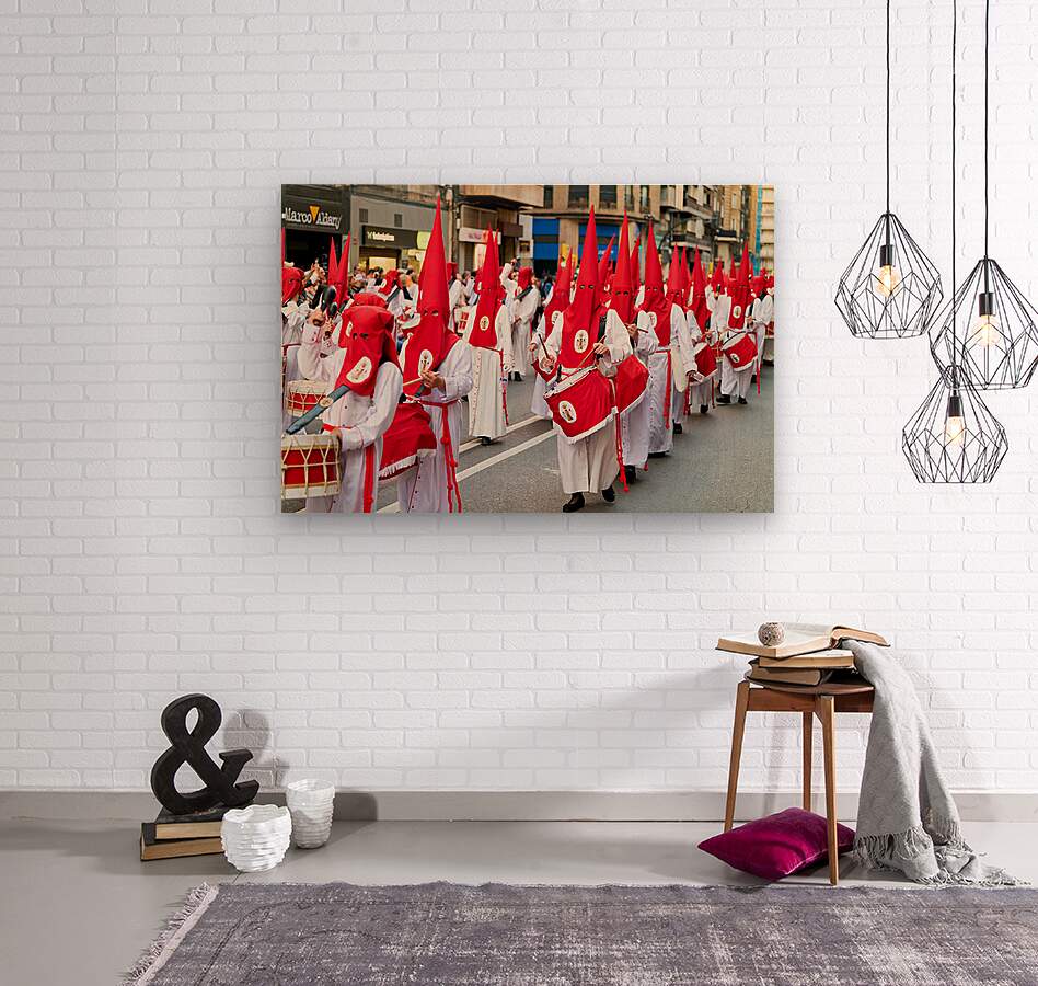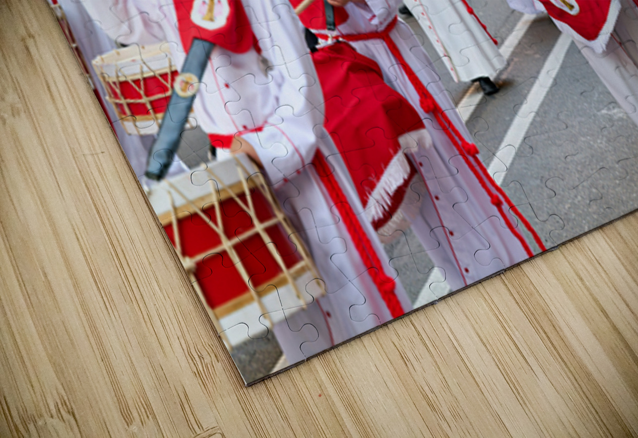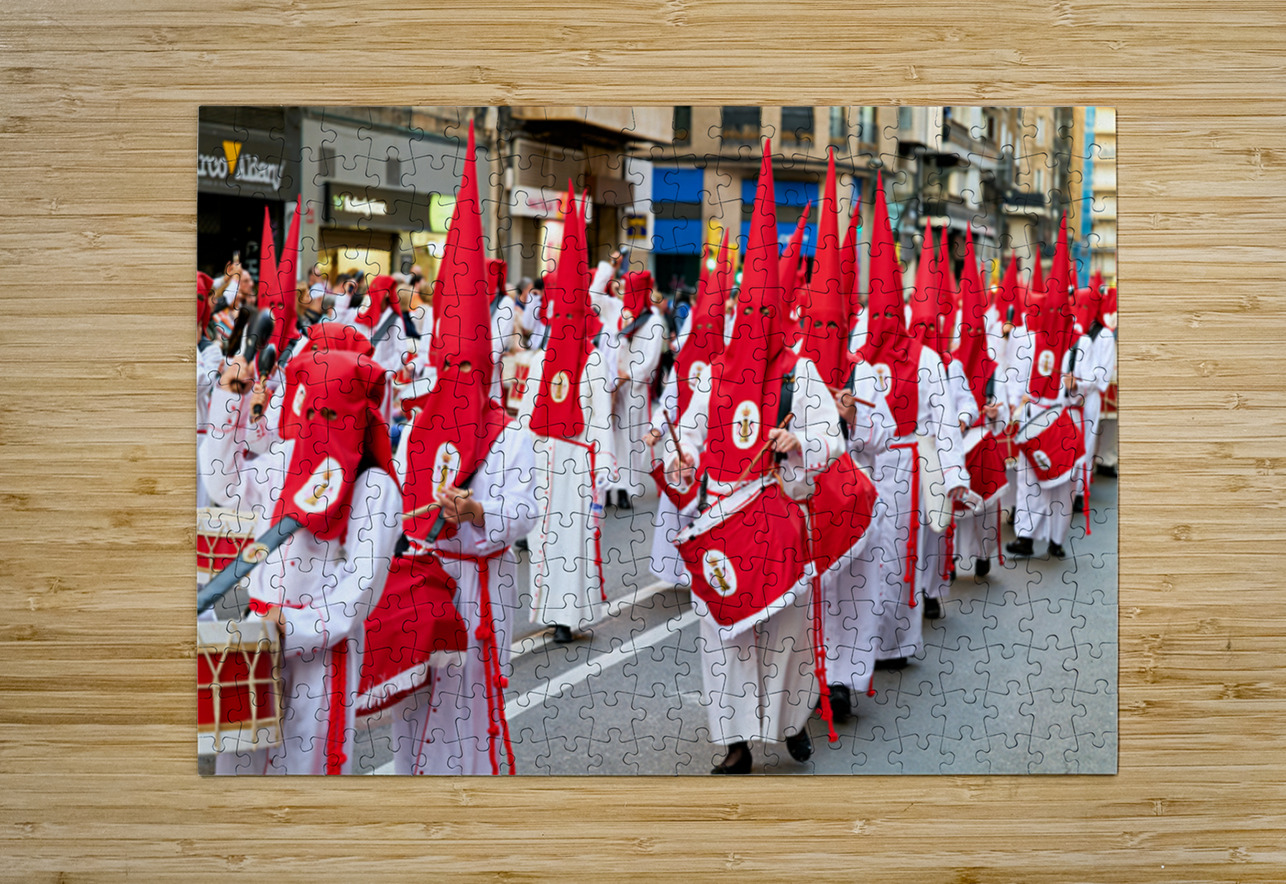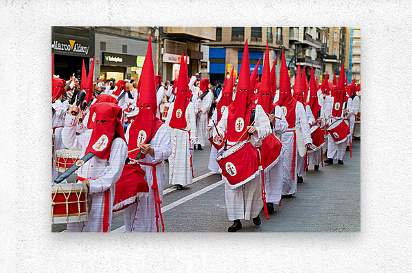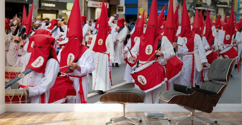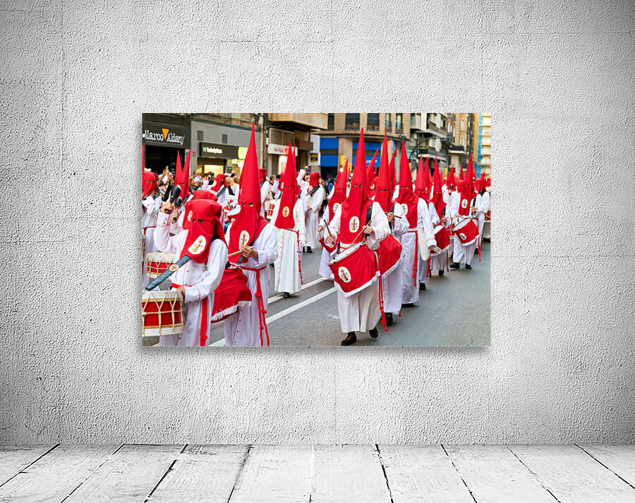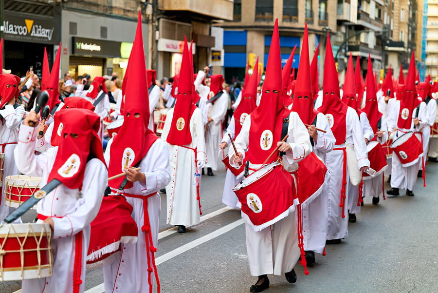 Crowds gather in Zaragoza for the processions of Easter Holy Week. Participants wear traditional robes and carry drums through the streets.