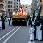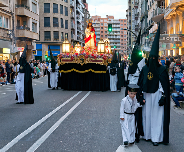 People participate in processions for Easter Holy Week in Zaragoza. A float carries a figure of Jesus through the streets while onlookers watch.